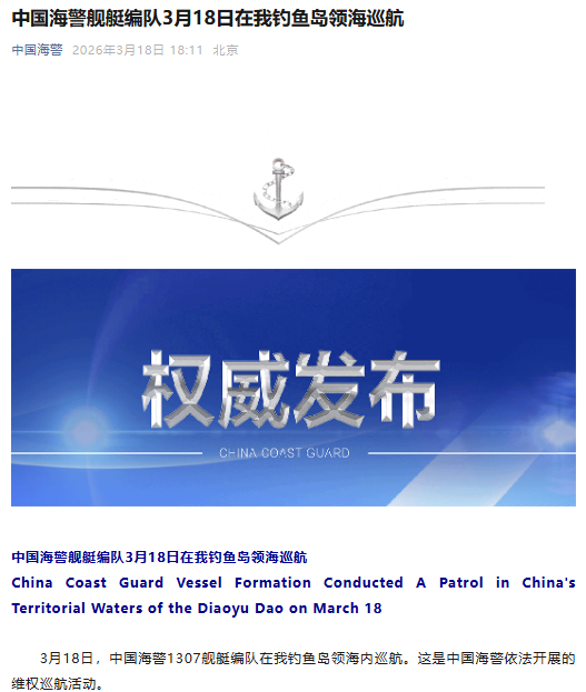 3月18日,中国海警1307舰艇编队在我钓鱼岛领海内巡航。这是中国海警依法开展的维权巡航活动。